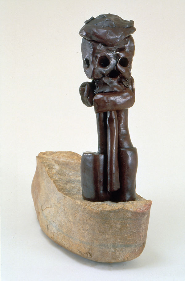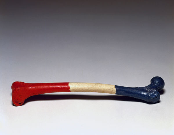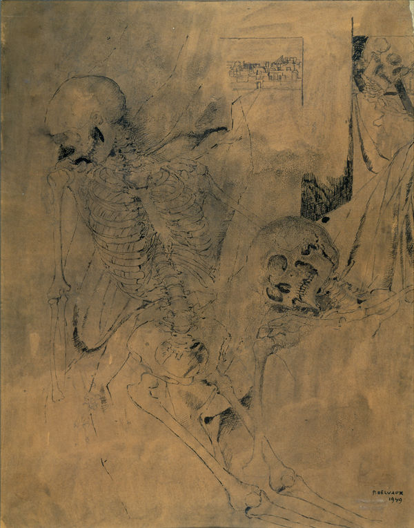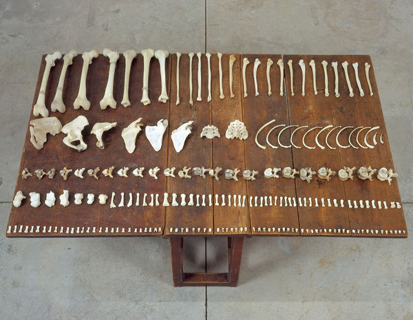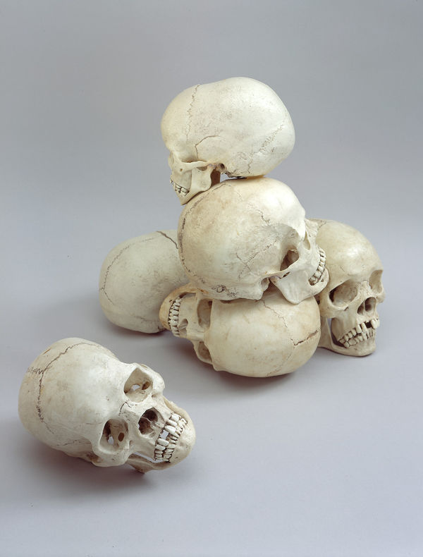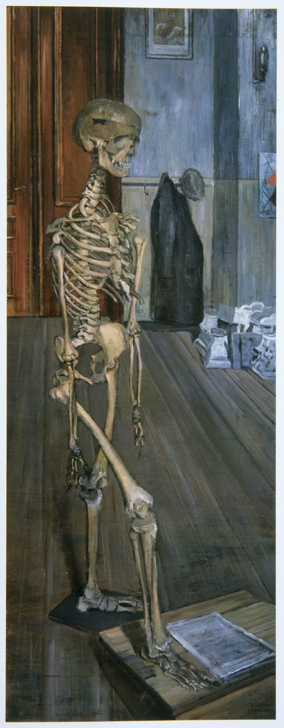 The works in this exhibition are inherently connected to a long history of the skeleton's artistic representation, and are emblematic of human nature's ongoing and understandably invested interest in mortality. In his essay for the exhibition catalogue, Tricot summarizes the history of this representation, as well as the skeleton's appearance in science, literature and philosophy. Hidden but intrinsic to all living beings, the revealed skeleton has long been a harbinger of imminent death, directing the destinies of souls. It has appeared in its iconic, nightmarish uniform of black cape and scythe, has danced naked in a medieval jumble of bones (the "danse macabre"), and has waited patiently, skull-only, on the side table of a vanitas painting, with a vase of wilting flowers and a half-empty hour glass. Repeated, abstracted, and stylized through out history, the skeleton indicates the inevitable passing of time and ultimately mocks the fruitless hope for immortality.