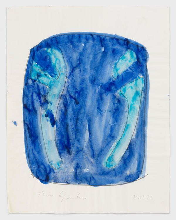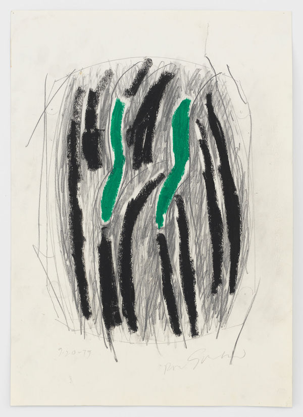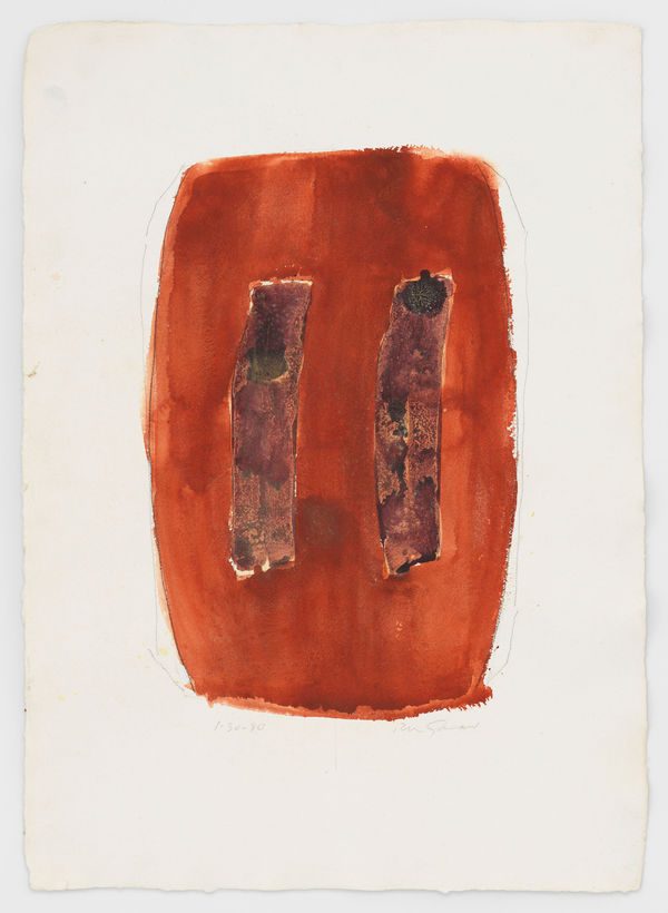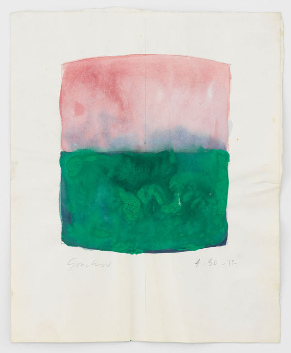 The watercolors presented here offer a compact overview of the artist’s formal concerns and varieties of expression — from a simple juxtaposition of pink and green planes to multicolor architectonic structures, and from twinned floating forms to raw slashes, smears, and drips. Their freewheeling emotional range and openness to accident offer a striking contrast to the material austerity and at times doctrinal strictures of Minimalism, which was then dominating the critical conversation. Even the most spare and elemental piece in the exhibition, a linear pencil drawing from 1973, feels warm, loose, and buoyant.