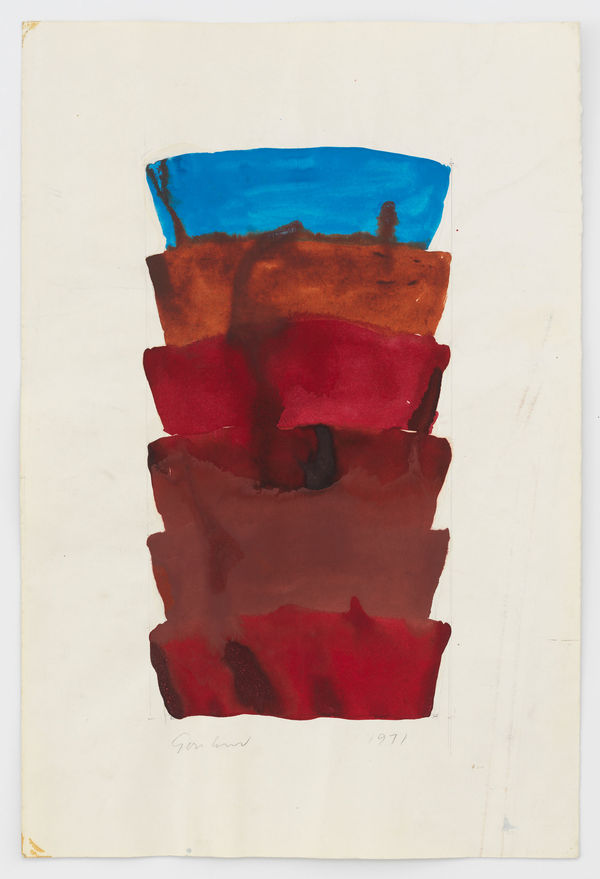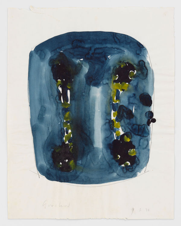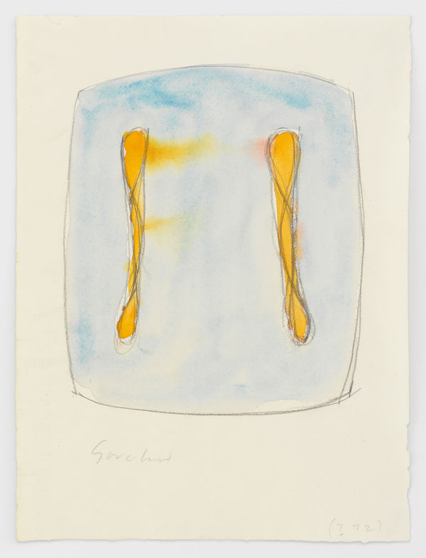 By virtue of their scale and their medium, Gorchov’s watercolors underscore the artist’s inherent lyricism and the depth of his coloristic brilliance. Many feature paired shapes residing on either side of the page, reflecting the elegant compositional balance that the artist often explored in his curved canvases. Others are related to his sculptural “Stack” paintings, in which monochromatic convex canvases rise in totem-like configurations from the floor. Several of these images appear to refer to a proposed public art project from the early 1970s, in which narrow stacks of paintings act as pillars supporting billboard-size panels.