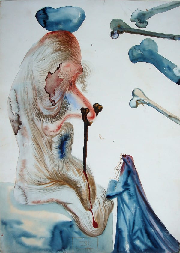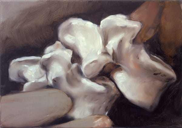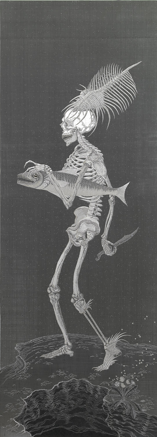 The works in this exhibition are inherently connected to a long history of the skeleton's artistic representation, and are emblematic of human nature's ongoing and understandably invested interest in mortality. In his essay for the exhibition catalogue, Tricot summarizes the history of this representation, as well as the skeleton's appearance in science, literature and philosophy. Hidden but intrinsic to all living beings, the revealed skeleton has long been a harbinger of imminent death, directing the destinies of souls. It has appeared in its iconic, nightmarish uniform of black cape and scythe, has danced naked in a medieval jumble of bones (the "danse macabre"), and has waited patiently, skull-only, on the side table of a vanitas painting, with a vase of wilting flowers and a half-empty hour glass. Repeated, abstracted, and stylized through out history, the skeleton indicates the inevitable passing of time and ultimately mocks the fruitless hope for immortality.