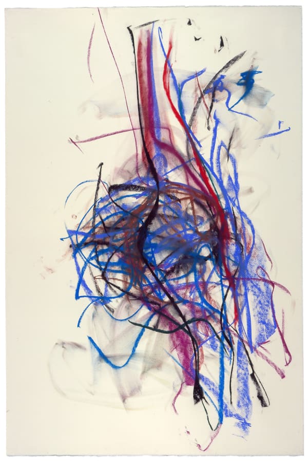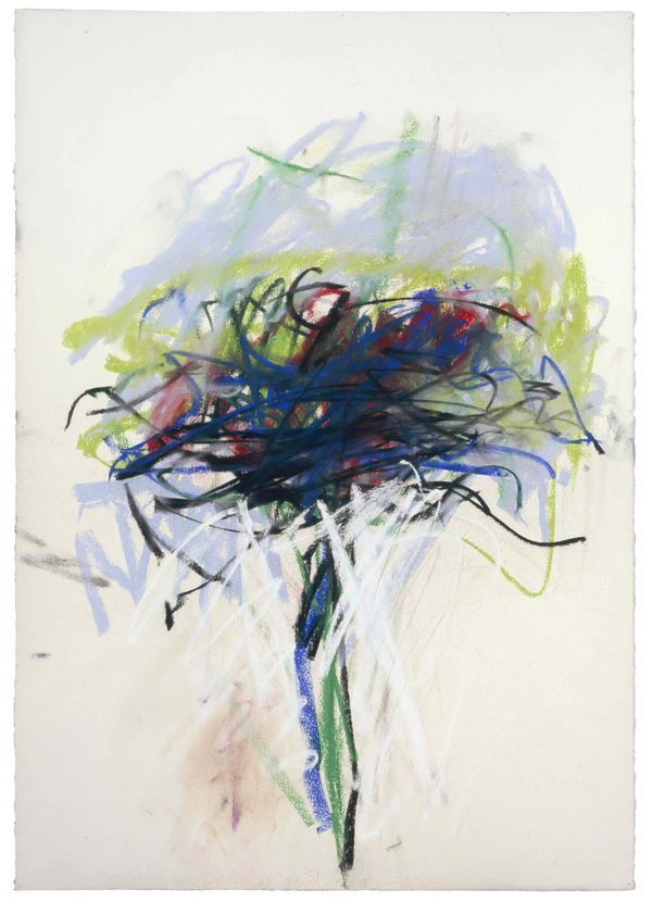 For Mitchell, drawing and painting were related but autonomous activities. Her pastels can be as dense as oil paintings, and her oil paintings can be as light and airy as watercolors. The exhibition includes art from each decade of her career, with a formal range spanning flurried strokes and gestural lines of rhapsodic color, to darkly massed forms and complex, multi-panel formats. Featured among the large works in oil on canvas are the ravishing diptych “Heel, Sit, Stay” (1977) and the turbulent “La Grande Vallée XVI Pour Iva” (1983), painted in high contrasts of indigo, violet, lemon and lime.