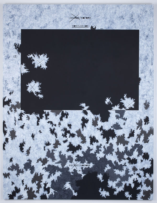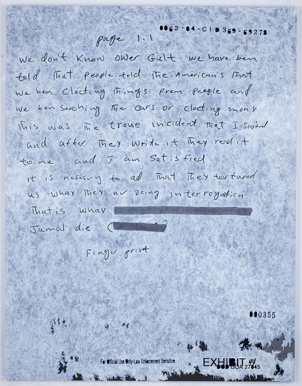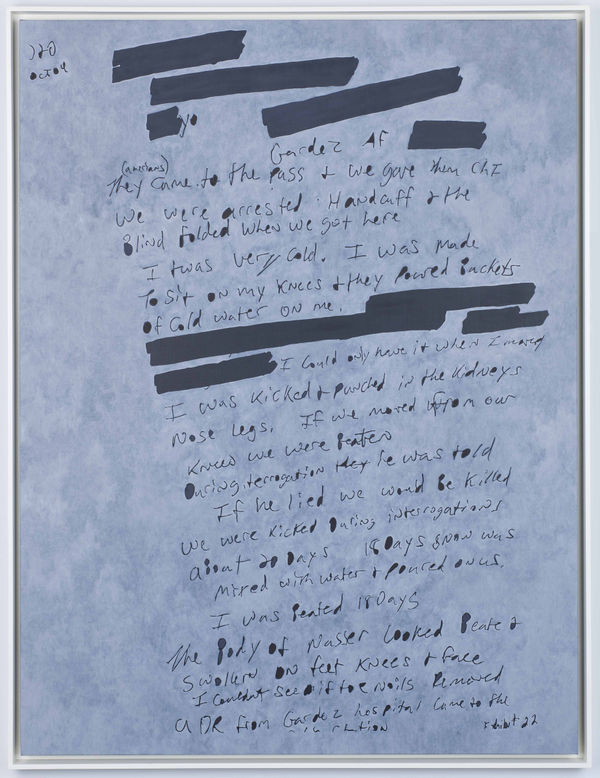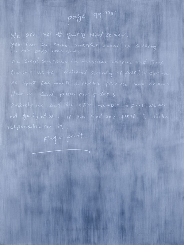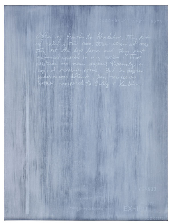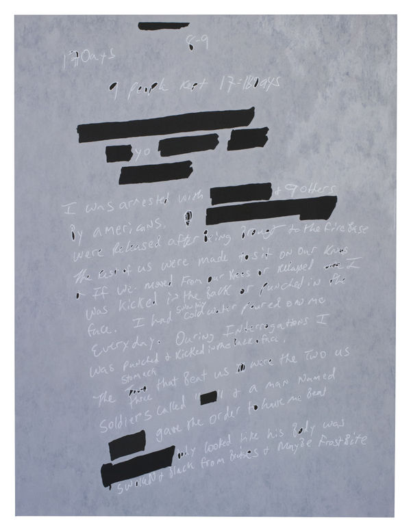 Jenny Holzer has used government documents as a source for her work since 2004. Language has been Holzer’s primary medium since the late 1970s. Placed on electronic signs or stone benches, Holzer’s text investigates how ideas are transformed from argument or opinion into fact. While her work has a conceptual base, she involves her viewer through what’s intensely physical. Turning to government documents in 2004, months after the invasion of Iraq by the United States and the United Kingdom, Holzer tried to reconstruct the path to war from the language of its architects and executors. The documents painted most recently trace the political fallout and human wreckage in the global war on terror. Holzer’s new works, hand-rendered, return flesh to events.Multiple paintings use the U.S. Army Criminal Investigation Command’s Gardez Report as source material. The report details the investigation of Jamal Naseer’s death. Naseer was an Afghan prisoner who died in the custody of U.S. Special Forces. One of eight men made to kneel on the ground while a mixture of snow and water was poured over them, Naseer sustained beating on the back, face, and legs. The descriptions of stark conditions are evoked in the paintings, many of which are painted in whites, blacks, and grays. Holzer’s grounds can disintegrate or are left incomplete leaving ragged black holes, and backgrounds can enter words, making text difficult to decipher.