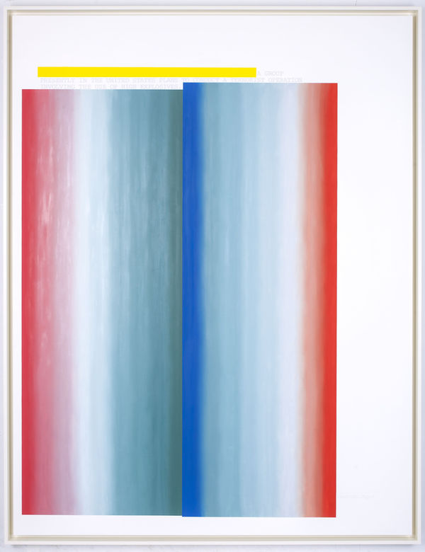 In a second group of paintings based on heavily redacted CIA and FBI reports, once black blocks of censored text have been replaced by color and now recall Suprematist or Color Field paintings–but language interjects. Words like “secret” and “terrorist operation” escape redaction and interrupt a formal assessment that might land in the abstraction of Kazimir Malevich or Ad Reinhardt. History makes a violent return to art history. A few paintings exhibit color bands and merges in homage to poignant late Malevich realist works.