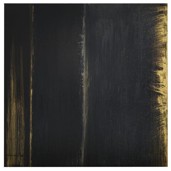 Steir’s work conveys a sense of vast, infinite space while simultaneously bringing attention to the pigment-strewn flatness of the painted surface. This simultaneity is at the core of her practice, and is a reflection of her long-standing interest in ancient Chinese philosophy and artistic traditions. Though painted on one support, Steir’s compositions are often bisected by a centerline, requiring the viewer to oscillate between both halves of the painting. As Rubinstein remarks, this has the effect of opening one side as it closes the other, echoing concepts of Chinese painting in which binary pairs, like “opening/closure,” “empty/full,” and “rising/falling,” are integral to the work’s realization. The two sides of Steir’s paintings interact at their centers, sometimes merging together and sometimes separating: the centerline both divides and eternally connects. For Steir – who has said, “all my work is a search and an experiment” – harmony relies on the duality of opposites, and the unpredictability and spontaneity in their making.