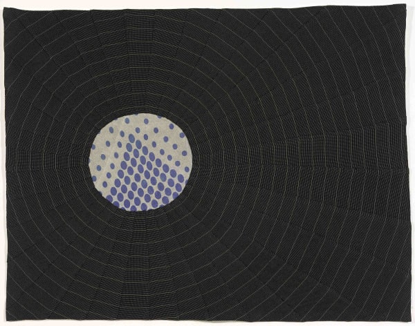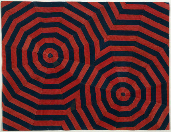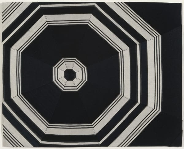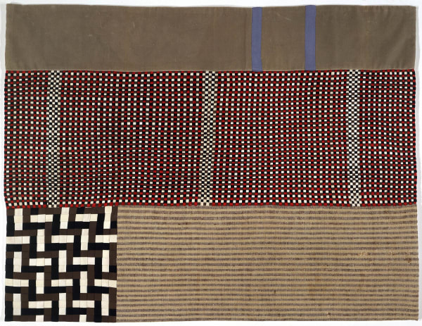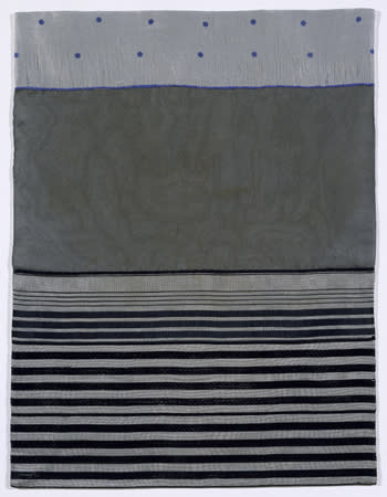 Some of Bourgeois’s works, as in the stitched three-dimensional sculptures, evoke the corporeality of the body and its fetishistic associations, while others, like empty dresses suspended from hangers, are ghostly in their absence of the wearer. Often incorporated within large-scale sculptural installations (the Cell series, for example), fabric components contributed to a larger narrative. Bourgeois’s two-dimensional fabric “drawings,” are more abstract; made from discarded clothing, the deconstruction of the original garment eliminates an overt reference to the body. Instead, layers of color, texture and pattern are placed in careful, sometimes intricate, juxtaposition, the associations with Bourgeois’s biography intertwined with the visual punch of their geometric compositions. Her concerns, however, remain recognizable: webs, spirals and vertiginous forms dominate, skewing the modernist grid. Allusion to landscape plays an important role (see “The Waiting Hours,” 2007, and the cloth book titled “Dawn,” 2006), as do the additions of orifices and sac-like elements. Color provides lyrical continuity. As Germano Celant notes, the works also reference art historical precedents; he cites the craft-oriented explorations of the Russian Supremacists and the Italian Futurists, and the “rational formality” of modernist Bauhaus textiles, to which Bourgeois’s woven works seem most closely aligned (Anni Albers provides an apt comparison).