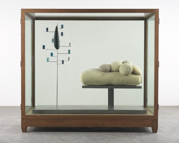 A sculptural installation from 2010 brings many elements of Bourgeois’s fabric work together. Assembled in a large vitrine, as if on stage, an armless torso-like shape lays supine on a metal slab, its chest piled with several stuffed berets. The berets, punctuated by their pointed tops, resemble breasts, while their significance provokes multiple associations – referencing the beret’s identification with intellectuals and artists, as well as with the French, Bourgeois alludes to her own history and homeland. Nearby, thread bobbins rest on a metal spooling tree, nodding to the process of sewing and reparation. Hanging from the same structure, a limp, dark, rubber form is evocative of Bourgeois’s earlier sculptural works, and engages a dialogue with the symbolic and the psychological. At once anthropomorphic and abstract, the strength of the work’s formal elements provides visual structure to a tableau suffused with enigmatic narrative. Bourgeois: “It is not an image that I am seeking. Its not an idea. It is an emotion you want to recreate, an emotion of wanting, of giving and of destroying.”