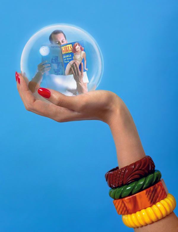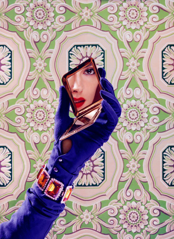 Representing "the struggle of what beauty presents to the individual and the power that it commands," McDermott & McGough recognize the distance between the remote, ultimately "unreal" look of their objectified subject and the contemporary viewer. In Always Reminding Me That We're Apart,1955, 2010, a purple-gloved woman looks at the viewer through her fractured reflection in a compact mirror, reducing her image to a diamond-shaped wedge and further enforcing her remove from the audience - a condition strongly supported by the work's title. The search for one's own identity and existence is modeled by fantasies and daydreams. Desire for beauty is reliant on a pose.