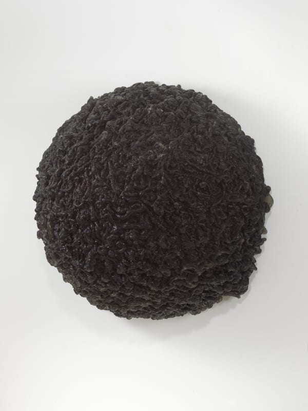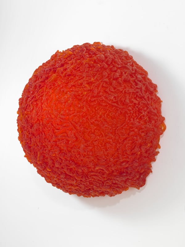 Likewise, the tall and narrow stainless steel "totems", which have been cast from wax models, memorialize with surprising intimacy the touch of the artist's fingers, seducing the viewer into an imaginative identification with the artist herself. The massive orange urethane hemispheres similarly record the processes of their making: in this case, the accumulation of material substance. As much as these works stand-in for process, they, too, like the bronze wall hangings, court the specter of absence, for the moment of their creation has already passed.