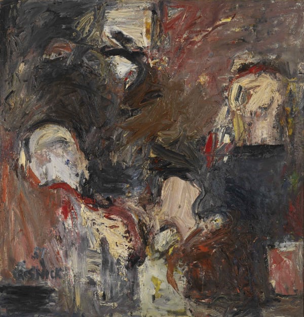 In BW and Alice, both from 1957 and on view in this exhibition, Resnick combines thick black lines, muscular shapes, and brooding color to create the building blocks of rich, jagged abstractions. They are strongly related to Low Gate, 1957, which is now in the collection of the Whitney Museum of American Art in New York. Two other works, Freehold and Untitled, also from 1957, attest to the fecundity of that year with their viscous, swirling brushstrokes and eruptive bursts of velvety blacks and greys interrupted by glowing reds and blues.